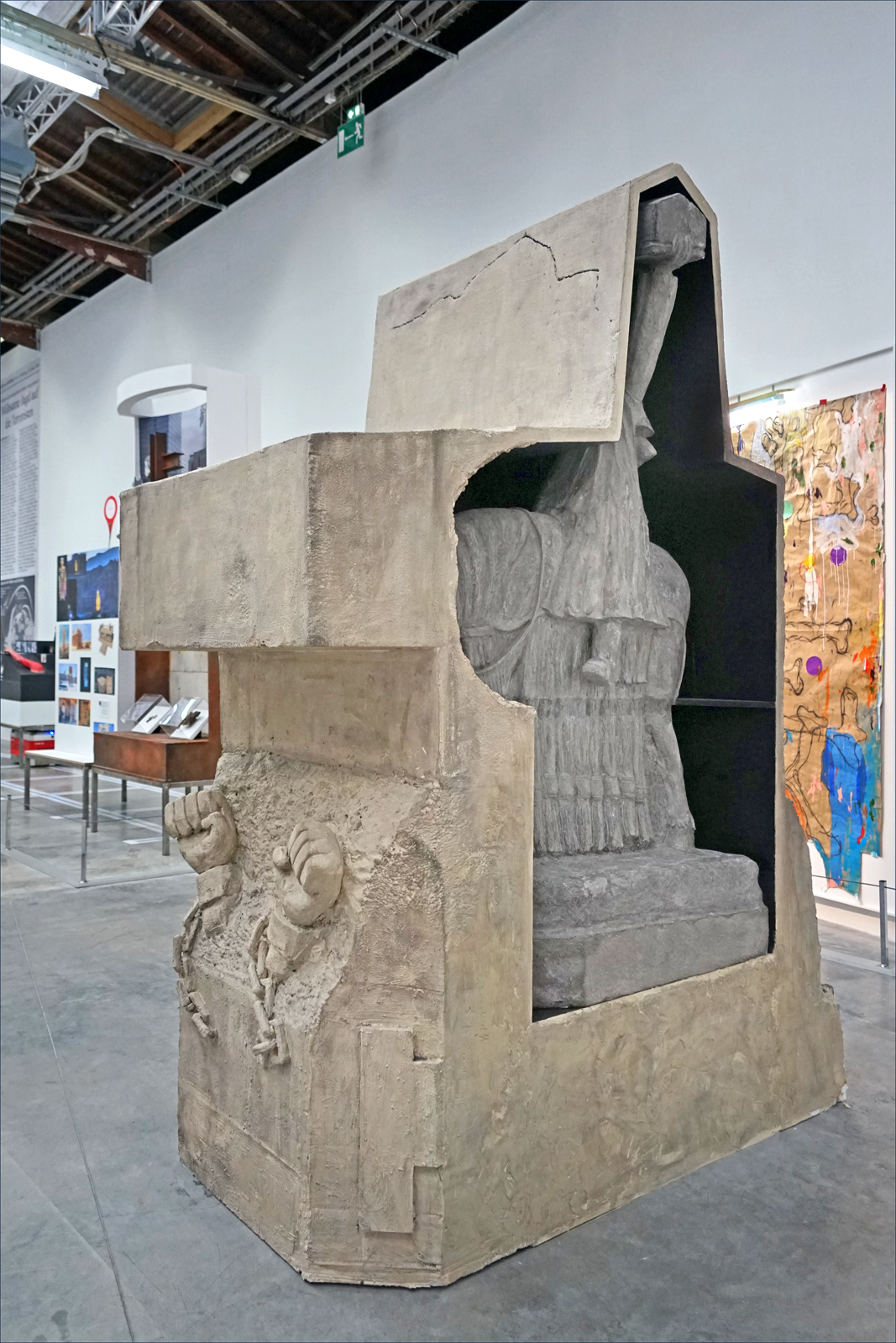 Une maquette du Pavois d’Alger au Palais de Tokyo Une maquette en plâtre du Pavois coffré est visible au Palais de Tokyo jusqu’au 13 mai 2018 dans le cadre de l’exposition de Neïl Beloufa, « L’Ennemi de mon ennemi ». ©Palais de Tokyo « L’Ennemi de mon ennemi est un projet conçu par Neïl Beloufa à l’invitation du Palais de Tokyo, un dispositif scénographique représentant de façon chaotique et parcellaire la manière dont s’écrit l’Histoire et se légitiment les pouvoirs aujourd’hui. S’inspirant de la communication officielle, des mémoriaux, des musées de guerre, de la propagande politique mais aussi de l’actualité, de la publicité ou des jeux vidéo, l’exposition met en scène l’interchangeabilité des stratégies et des discours. Ce faisant, elle joue sur une ambigüité permanente entre le bien et le mal, les gentils et les méchants, les postures et les impostures. Le dispositif scénographique, spécialement conçu par l’artiste pour l’exposition, intègre des œuvres, des documents, des images, des artefacts, des reproductions et des objets réels déplacés en permanence par des robots, selon un scénario de type algorithmique. Il propose ainsi une remise en cause permanente des associations, des perspectives et des significations. » ©Jean-Pierre Dalbéra ©Jean-Pierre Dalbéra ©Jean-Pierre Dalbéra « S’il fut un temps où les artistes proposaient des images que le pouvoir ne souhaitait pas voir, aujourd’hui il les suscite, les désire, les consomme, et paradoxalement représente sa liberté à travers elles. Comment, alors produire quelque chose d’inutilisable ? » Neïl Beloufa Pour plus d’infos sur l’exposition et l’artiste: http://www.palaisdetokyo.com/fr/evenement/neil-beloufa-0