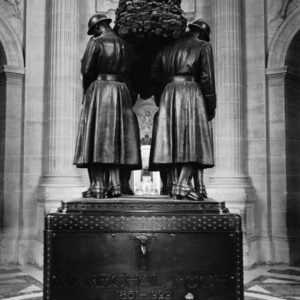Tombeau du Maréchal Foch Eglise Saint-Louis des Invalides, chapelle Saint-Ambroise, 75007 Paris 1937 Landowski adapte pour ce monument un projet de Tombeau du soldat qu’il souhaitait réaliser depuis longtemps. « Tout le peuple portant le mort. Voilà le couronnement du monument », écrivait-il dans son Journal en 1929. Il place des porteurs « modernes ». Les huit soldats constituent « une scène vraie, d’où sa noblesse, son émotion, sa gravité » (Journal, 1943). Le bronze a remplacé le marbre dans lequel il voulait initialement le tailler. L’original en plâtre des bas-reliefs est conservé au musée de Lunéville.
